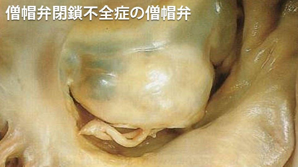 僧帽弁閉鎖不全症はリウマチ性のものもありますが、僧帽弁逸脱症や腱索断裂による変性による場合が多く認められます。腱索というのは僧帽弁の弁尖を左室側から支えている「ひも」のようなものです。この一部が伸びたり、切れたりして、弁を支える力が弱くなり、弁の一部が左房側にひっくりかえるようになって逆流が起こる病気です。 左心室から大動脈へ送られる血液の一部が逆流ため、左心室は余分に仕事をしなければなりません。その結果、左心室は大きくなってきます。もっと進行すると、左心室は大きくなるだけではなく、左心房に負担をかけますので、僧帽弁狭窄症のときと同じように息切れが出たり、肺に水がたまったりします。